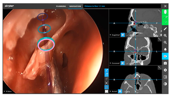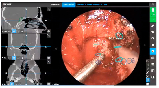 Augmented reality superimposed onto live endoscopic video with the Stryker Scopis navigation system (Stryker Corporation, Kalamazoo, MI, USA). Reprinted/adapted with permission from Ref. [25]. 2022, Stryker Corporation.