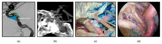 The cavernous sinus spaces and the cavernous segment of the internal carotid artery (ICA) from imaging, microsurgical transcranial and endoscopic endonasal perspectives. (a) Angiogram, lateral view of the ICA. (b) CT angiogram, lateral view of the ICA. The relationship of the ICA with the sphenoid bone is observed. (c) Cadaveric dissection demonstrating a superolateral view of the middle fossa and ICA via a transcranial approach. (d) Cadaveric dissection demonstrating an endoscopic endonasal view of the relationship of the cavernous ICA with the nerves on the lateral wall of the cavernous sinus. Reprinted/adapted with permission from Ref. [18]. 2022, Erion Junior de Andrade, M.D., M.Sc.