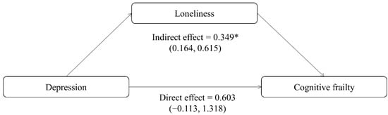 Mediating effects of loneliness on the association between depression symptoms and cognitive frailty in community-dwelling older adults. 95% confidence intervals are presented. Models control for gender, age, BMI, education, marital status, household arrangement, monthly income, cigarette smoking, alcohol drinking, polypharmacy, annual check-up, and sleep disorders. * p < 0.05.