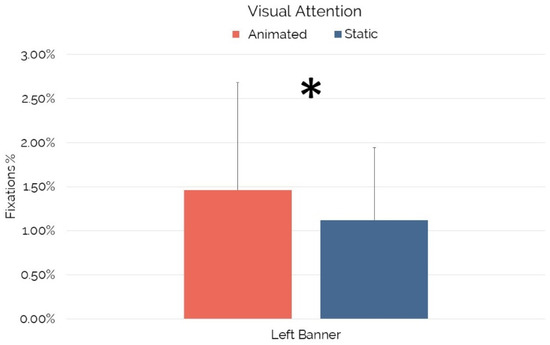 Concerning the investigation performed on the “Left Banner”, which was available in static or animated format, the Wilcoxon signed-rank test revealed a significant increase in visual attention for the animated “Left Banner” in comparison to the “Left Banner” shown in static format (Z = −2.658, p = 0.007, r = −0.28) (see Figure 2).
