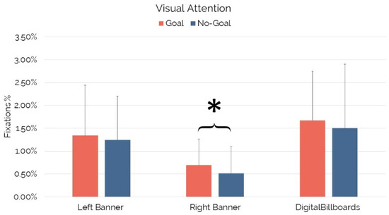 According to the type of scenes shown, the Wilcoxon signed-rank test revealed that visual attention significantly increased for the “Right Banner” in “Goal” scenes in comparison to the “Right Banner” in “No-Goal” scenes (Z = −2.658, p = 0.008, r = −0.27). No statistical differences were detected while comparing the visual attention elicited by the “Left Banner” (p = 0.568) or the “Digital Billboards” (p = 0.095) in the “Goal” and “No-Goal” scenes (see Figure 3).