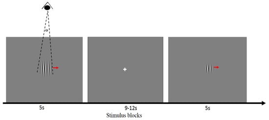 The stimuli were generated on a Windows computer with MATLAB (The MathWorks Inc., Natick, MA, USA). Then, using E-prime (Psychology Software tools, Inc., https://www.pstnet.com/eprime.cfm accessed 20 January 2022) software, the stimuli were embedded into an event-related fMRI paradigm and displayed through an MR-compatible Avotec LCD projection system. The projector was located at the rear of the scanner room, and it projected the images onto a translucent screen attached to the inside of the scanner bore. The subjects viewed the projected images via a mirror mounted over the subjects’ eyes, with a total viewing distance of 113 to 115 cm. Since the screen position inside the scanner was fixed, the possible variability was the distance from the mirror to the subjects’ eyes. We measured the distance from the mirror to the center between eyes for each subject, and the estimated mean total viewing distance across all subjects was approximately 114 cm. The up–down range (height) of the screen subtended 10.5° of the visual angle, and the screen width subtended 13° of the visual angle. The stimuli consisted of six different sizes of rightward drifting gratings and a white cross fixation. Six varying sizes of moving sine wave gratings (Gabor patch) [31] over the receptive field were used to localize magnocellular LGN cells and evaluate the feedback effects on magnocellular LGN cells. The drifting Gabor patch stimuli were 50% luminance contrast, vertical black and white sinusoidal gratings with a spatial frequency of 1 cpd (cycle per degree). To maintain comparability, a 60 Hz display refresh rate, a 25 Hz frame rate, a constant stimulus horizontal velocity of 2.1° s−1 and constant screen brightness were used for all subjects. The outer borders of the patches faded into gray to avoid sharp edge effects. In order to obtain center-surround interactions, we had six varying sizes of patches corresponding to 0.25°, 0.5°, 0.75°, 1°, 2°, and 3° of visual angle (Figure 1). A centered white fixation cross was used between the patch stimuli, and it subtended 0.1° of the visual angle. The background was a gray screen. For each run, the display sequence of the six patches was randomized, and each patch size was repeated 6 times and shown for 5 s. The interval time for fixation between patches was randomized between 9 and 12 s (Figure 1). A video of the stimulus is included as a Supplementary File. In summary, for each subject, there were two runs, and 36 stimuli were shown in each run, lasting around 10 min.