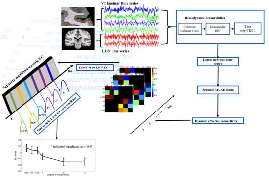 To date, most findings about these feedforward and feedback pathways come from anaesthetized animals with invasive methods such as single unit recordings [2,3,20,21,22,23,24]. Although these studies have certainly increased our knowledge of corticogeniculate feedback mechanisms, it is imperative that they be confirmed in conscious humans. Therefore, we propose an experimental paradigm employing noninvasive imaging methods such as high-resolution functional magnetic resonance imaging (fMRI) at ultra-high fields (7T) coupled with an analysis framework which could potentially be generalized to investigate laminar-level microcircuitry in any part of the human brain. Recent noninvasive studies have successfully employed high-resolution fMRI to investigate the top–down feedback effects on laminar fMRI response in the primary visual cortex [25,26]. However, they infer the effects of feedback and feedforward pathways by clever manipulation of the experimental design by masking some of the effects to indirectly infer these mechanisms. For example, Muckli et al. found that bottom–up feedforward sensory information from external stimuli predominantly activate the mid-layers of the visual cortex while contextual feedback from higher-order regions (inferred by masking the external stimulus) predominantly activated superficial layers. This agrees with what we know about laminar anatomy, i.e., feedback from neurons in higher order regions terminate in superficial layers of the visual cortex. Therefore, using clever experimental manipulation, it is possible to indirectly infer laminar connectivity at a functional level using laminar activation profiles. In contrast, we propose a framework wherein these effects can be directly tested using standard fMRI paradigms and the use of advanced brain connectivity models. To the best of our knowledge, no previous fMRI studies have directly investigated laminar-level feedback or feedforward pathways in the human brain. Here, we pick the example of the magnocellular pathway between LGN and the primary visual cortex (layer IV and layer VI) in the human brain—the feedback from layer VI to LGN, and the feedforward from LGN to layers VI and IV of the primary visual cortex as well as from layer IV to layer VI within the primary visual cortex—since the visual system in general and the lower level circuit involving the LGN and the primary visual cortex in particular are largely similar in humans and animals [27,28,29]. This allows us to form hypotheses based on invasive animal literature that can be tested in humans. However, the proposed framework in itself is generally applicable to any other brain system. This is important given the fact that the similarities between animal and human brains begin to diminish beyond sensory systems and hence, once our method is established in the visual system, it will pave the way for a fine-grained mechanistic understanding of the brain’s laminar-level functional connectome in more complex domains such as cognition and language.