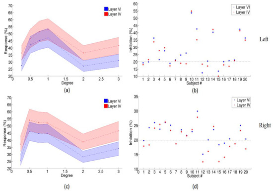 Two flattened patches of cortical surface containing significantly activated clusters within the left or right primary visual cortex were identified and extracted from each intermediate surface (Figure 2). Within the defined ROIs of the primary visual cortex, the mean percentage signal changes corresponding to each visual stimulus condition for each subject were determined. We found center-surround inhibition in primary visual cortical neurons as shown in Figure 6a,c and Table.2. The maximum center-surround inhibition (the larger of the difference in responses (1°–2°) or (1°–3°)) reached up to 54.86% for layer IV and 53.62 % for layer VI of the left primary visual cortex (Figure 6b, subject 10), 29.92% for layer IV, and 27.84% for layer VI of the right primary visual cortex (Figure 6d, subject 11). More than 20% center-surround inhibition was found in 14 subjects within the left primary visual cortex (Figure 6b) and in 10 subjects within the right primary visual cortex (Figure 6d). A comparison of the BOLD response due to different stimulus conditions for layer VI (shown in Table 2a and Table 3a for left and right primary visual cortex, respectively) and layer IV (shown in Table 2b and Table 3b for left and right primary visual cortex, respectively) within the primary visual cortex showed that the responses for 0.5°, 0.75°, and 1° conditions were significantly greater than the response for 0.25°, 2°, and 3° stimuli. Moreover, the fMRI response in layer IV was stronger than that in layer VI during the display of six different types of stimuli targeted at the magnocellular visual pathway (Table 2c and Table 3c). In addition, using a two-way ANOVA, we assessed the main effects of two different factors—visual stimuli and layers. We found both main effects to be significant (p < 0.05 FDR corrected), but the interaction between them was not (Table 4).