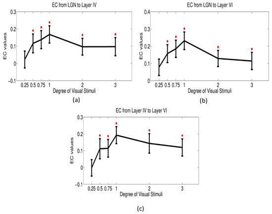 Mean/standard deviations of effective connectivity values vs. stimulus degree for feedforward pathway from LGN to layer IV in the primary visual cortex (a), LGN to layer VI (b), and layer IV to VI (c).