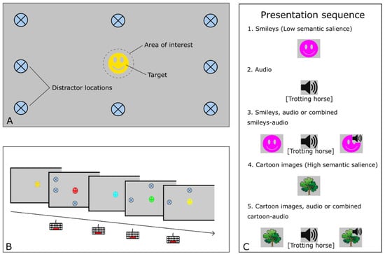 The test was divided into five presentation sequences that were separately and sequentially administered in a fixed order. Each presentation sequence contained one or multiple of the following five distractor modalities (see Figure 1C for an overview of the presented distractor modalities per presentation sequence): 1. Purple smiley shapes that are visually similar to the target (Smileys); 2. Easily recognizable sounds, e.g., a trotting horse or a honking car (Audio); 3. Purple smiley shapes combined with sounds (Smileys and Audio); 4. Cartoon images of everyday objects (Cartoons); 5. Cartoon images combined with sounds (Cartoons and Audio). In each sequence, color changes without any auditory or visual distractors were also added (No distractor modality).