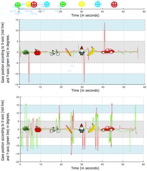 Two examples of a processed gaze signal during the fourth IDistrack presentation sequence of two participants (upper and bottom graph). Only Cartoon distractors were used in this presentation sequence. The X-axis represents the time in seconds. The Y-axis represents the X-co-ordinates (red line) and the Y-co-ordinates (green line). The grey area within the graph represents the location and surface of the area of interest (AOI) in the center of the screen. The timing of distractor presentation is visually represented within this area. The blue areas represent the peripheral location on the screen in which visual distractors were presented during the IDistrack task. The axis at the top of the figure shows the timing of the target color switches. This figure shows a difference in distractibility between the two participants as the gaze signal in the bottom graph shows more peaks into the distractor areas.