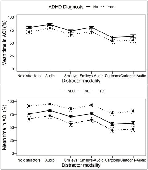 A significant main effect of subgroup on tAOI was found (FATS = 24.01, p < 0.001). Post hoc non-parametric pairwise comparisons show that the TD group spent significantly more time in the AOI compared to the NLD group and the SE group. Furthermore, the NLD group spent significantly more time in the AOI than the SE group (p < 0.001 for all comparisons; see Figure 3). Additionally, a significant main effect of distractor modality on tAOI was found (FATS = 86.69, p < 0.001). Non-parametric post hoc pairwise comparisons show that, irrespective of subgroup, the participants spent significantly less time looking in the AOI when Cartoon distractors or combined Cartoon–Audio distractors were presented, compared to all other distractor modalities (p < 0.001 for all comparisons). This indicates that irrespective of participant subgroup, visual distractors with high semantic salience have the strongest distracting effect. The results show no significant interactions of participant subgroup by distractor modality (FATS = 0.66, p = 0.67).