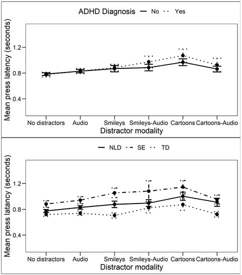 Mean manual press latency (PL) in seconds for subgroups based on presence of a formal ADHD diagnosis (upper) and neurological disorder (bottom). NLD—Neurological Learning Deficit; SE—Special Education; TD—Typically Developing. Error bars indicate the standard error of the mean (M ± SEM).