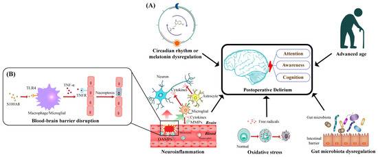 Inflammation is inevitable after surgery as a protective response to injury. However, peripheral inflammation may trigger neuroinflammation, leading to the dysfunction of the central nervous system (CNS) and the subsequent neurobehavioral and cognitive symptoms of postoperative delirium. Additionally, inflammation from the periphery to the CNS starts with increased permeability of the blood–brain barrier (BBB).