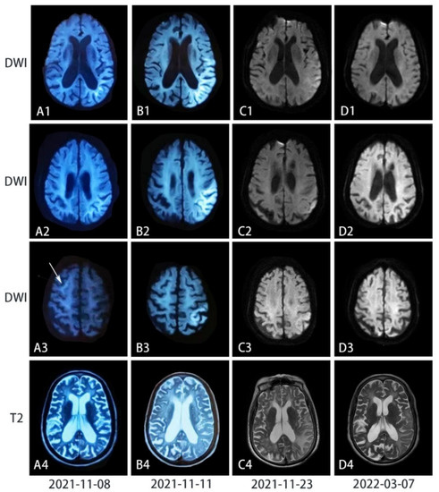 The patient was a 69-year-old female farmer presenting with mild memory loss in the past two years, which did not hamper her social activity or farming. On 2 November 2021, she had a sudden visual hallucination, which resolved hours later. In the next few days, she developed headaches, recurrent vomiting, cognitive impairment, speech difficulty, and generalized weakness. She was admitted to the local hospital on November 6th, and her symptoms peaked three days after being hospitalized when she was completely bedridden. There were not any prodromal symptoms of fever. She had a ten-year history of diabetes and diabetic retinopathy, which were controlled by acarbose, gliclazide, and metformin.