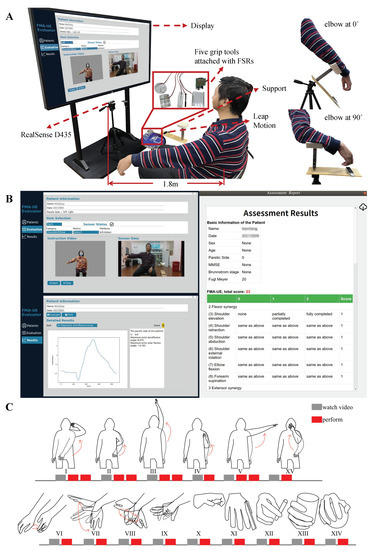 (A) The hardware setup and scene of the experiment. On the right are the two initial positions for the Wrist/Hand part. (B) The graphical user interface (GUI) of the assessment system. (C) The experimental protocol.