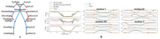(A) 18-joint skeleton of RealSenseD435. (B) The 3D coordinates of the wrist joint in the Shoulder/Elbow part motions. Left: The curves of raw RealSense (RS) data, data processed by two denoising methods, and Vicon data of motion I. Right: The SSA-filtered RS data and the Vicon data of four motions, and the red dots mark the motion start and end time.