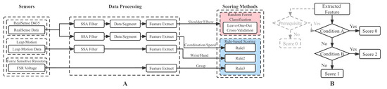 Figure 3A depicts the data analysis procedure of the proposed system, in which the extracted features are listed in Table 3. The data from sensors were first preprocessed, and then specific features were extracted. These features served as inputs to the scoring method. Different scoring methods were applied to different categories. The Shoulder/Elbow part was scored using random forest (RF) classification, an effective machine learning algorithm for estimating scale scores from kinematic features [28,29]. It has the advantages of non-parametric nature, feature importance evaluation capability, and high classification accuracy [30]. The other three were scored using rule-based (RB) logical classification, because the movement evaluation criteria are explicit and concise, suitable to directly abstract logical rules with interpretability for scoring. Meanwhile, it was also found that the RF classification could not achieve better results. The following two sections will separately introduce the automated evaluation process of the Shoulder/Elbow part and the other three parts in detail.