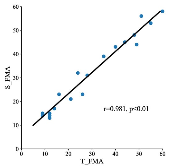 Correlation between S_FMA and T_FMA was particularly high (r = 0.981, p < 0.01) (Figure 4), indicating that the system has a strong ability to produce FMA-UE scores consistent with the therapist.