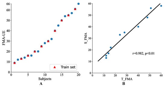In order to further verify the system value in practical applications, online testing was simulated. The FMA-UE scores of the 20 participating patients in this study are displayed in Figure 5A in ascending order, which are evenly distributed. As shown in the Figure 5B, Pearson’s correlation coefficient between S_FMA and T_FMA (r = 0.982, p < 0.01) of the simulated online test was equal to the offline test.