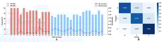 The single item result of MAE was highly negatively correlated with that of accuracy (r = −0.976, p < 0.01 for RF classification, r = −0.961, p < 0.01 for RB classification). The two indicators were almost identical, and most items with the same accuracy rate also had the same error. One possible reason is that the number of cross-level misclassification samples for this system was small. In the confusion matrix of Figure 6B, only 5.4% of 0 points were mistakenly predicted as 2 points, and 1.1% of 2 points were mistakenly predicted as 0 points. This additionally indicates that the system performs well under the comprehensive evaluation of these two indicators. In terms of the accuracy in 600 items, the order from high to low was score 2, 0, and 1. The characteristics of extreme levels tended to be more pronounced and easier to classify accurately. In contrast, the boundaries between median and extreme levels could be ambiguous, thus resulting in a worse result. Additionally, system errors generally occurred in evaluating a level higher than the therapist, which should be paid attention to when patients or physicians utilize the automated system results.