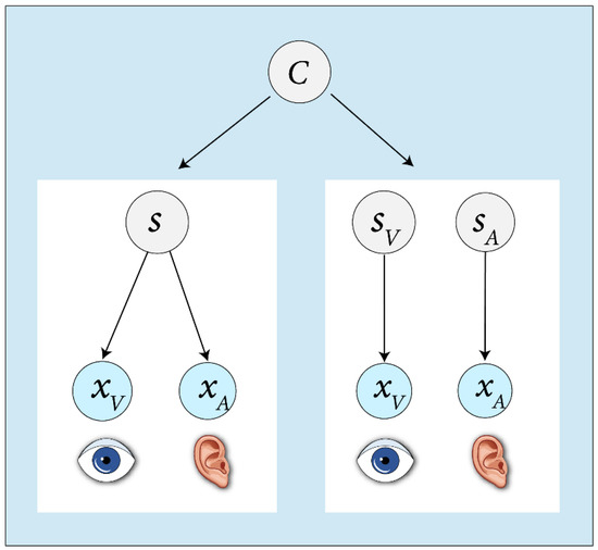 The generative model of Bayesian causal inference [5]. Two causal structures can give rise to auditory and visual stimuli and . Either a common cause ( has produced the stimuli , or independent causes and, have produced the two stimuli .