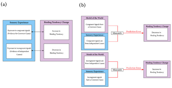 Learning mechanisms involved in binding tendency plasticity. Two possible learning mechanisms underlying the plasticity of binding tendency are illustrated. (a) The statistical learning mechanism: In this mechanism, every sensory event is informative and influential towards the tendency to bind. If an observer is frequently exposed to congruent audiovisual stimuli, each exposure increases the prior probability of a common cause by offering evidence of increased frequency of common-cause audiovisual stimuli. If an observer is frequently exposed to incongruent audiovisual stimuli, each exposure decreases the prior probability of a common cause. (b) The predictive coding mechanism. In this mechanism, only sensory events that contradict the internal generative model of the sensory environment will elicit updates in the prior probability of a common cause. For instance, if the internal generative model of the world expects that incongruent stimuli do not have a common cause, and an observer repeatedly experiences spatially incongruent but temporally congruent stimuli, these repeated sensory experiences contradict the internal model of the world and produce a model prediction-error signal. This results in a relaxation of binding tendency and an increased probability of common cause to account for the congruent stimuli that are nonetheless spatially discrepant. Adapted with permission from [28].