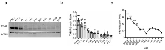 Previous studies showed that the expression of TXNIP in a healthy brain is prominently lower than in other organs [6]. This phenomenon raised the question of the biological function of TXNIP in the healthy brain, which is under-studied. Here, we investigated the expression profile of TXNIP in PFC of healthy mice from E14.5 (Embryonic 14.5 days) to P405 (postnatal 405 days), representing the stage from embryonic to middle-aged. Interestingly, we found TXNIP was highly expressed during the prenatal period; however, it rapidly decreased from the first week (Figure 1a,b). Its expression during adulthood was lower compared to the prenatal period. We also investigated its mRNA expression in human postmortem brains through the BrainSpan atlas (http://www.brainspan.org/ (accessed on 20 September 2020)). Similarly, TXNIP was highly expressed in the early prenatal stage, sharply decreased after that, and maintained a quite low level throughout adulthood (Figure 1c). This expression pattern was coincident across multiple brain regions. These results drive our hypothesis that TXNIP may play an essential role in brain function during the early stage.