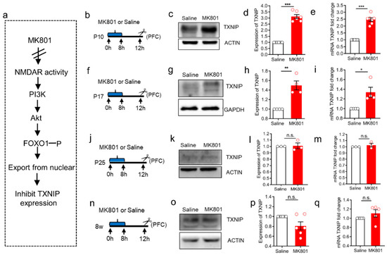 To examine our hypothesis above, we performed a simple paradigm in which a median dosage of MK801 (0.5 mg/kg) was systematically administrated to mice on different postnatal days. MK801 was pharmacologically used as the inhibitor of NMDAR activity, whose dysfunction has been linked to cortical oxidative stress [10,36] and is relevant for the pathophysiology of many psychiatric disorders [37,38]. Previous studies have demonstrated that the inhibition of NMDAR activity via MK801 could deactivate the phosphatidylinositol-3 kinase-Akt (PI3K-Akt) pathway, trigging FOXO dephosphorylation. Dephosphorylated FOXO translocates to nuclear and increases the transcription of TXNIP [39,40] (Figure 2a). We found that increased TXNIP expression was observed at P10 (Figure 2b–e) but decreased from P17 after MK801 administration (Figure 2f–i). There was no significant induction of TXNIP expression at both P25 (adolescent stage) (Figure 2j–m) and 8 w (adulthood) (Figure 2n–q) for either mRNA or protein level. This result indicates that compared to the later developmental stage, the expression of TXNIP is more sensitive to cellular stress (e.g., NMDAR hypofunction) during the early postnatal period, suggesting a critical role of TXNIP in regulating the sensitivity window of anti-oxidative stress during brain development.