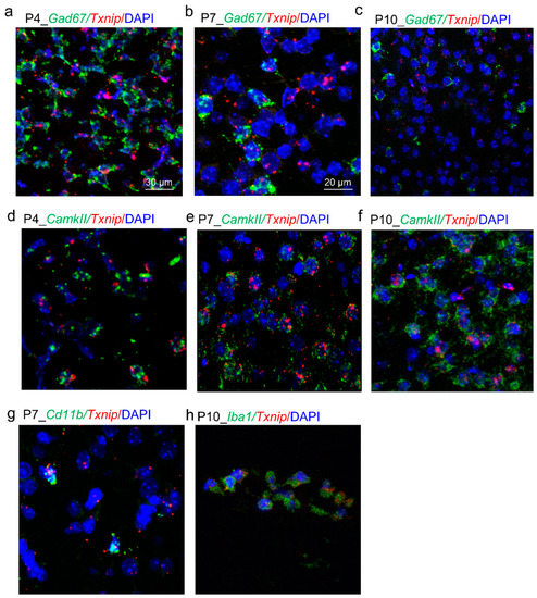 Previous studies [6,41,42] and recent single-cell sequencing of mice have identified the location of TXNIP primarily distributed in microglia, neuron, and astrocytes. However, these results are mainly focused on adult rodents. Since we aimed to explore the role of early expression of TXNIP in brain function, herein, we investigated its expression in PFC during different early postnatal days (from P4 to P10). We performed in situ RNA analysis using RNAscope, and we found Txnip mRNA sparkly distributed in GAD67 positive cells (GABAergic neurons) in PFC of P4 and P7 mice, especially at P4 (Figure 3a,b). However, its expression was not observed in GABAergic neurons at P10 (Figure 3c). In contrast, Txnip mRNA was expressed in CAMKII positive excitatory neurons across P4 to P10 (Figure 3d–f). We detected the scattered expression of Txnip mRNA in microglia at P7 using RNA scope (failed to detect at P10 and P17) (Figure 3g). After isolating microglia from PFC of P10 mice, we also identified protein expression of TXNIP via immunofluorescence staining (Figure 3h).