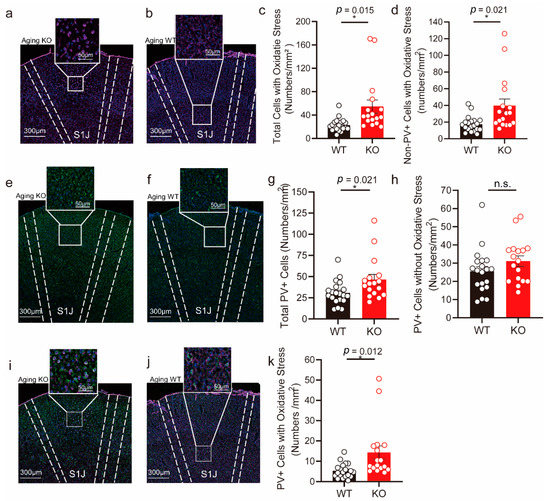 Although the expression of TXNIP in the early postnatal period was not cell-type-specific, this study mainly focused on its function in fast-spiking PVIs. PVIs are the primary class of GABAergic neurons and are highly sensitive to oxidative stress due to their higher demand for energy than other neurons [25]. Aging contributes to many physiological modifications, including declining higher cognitive processes such as memory functions. Higher cognitive functions depend critically on gamma oscillations (30–100 Hz), which results from the activity of PVIs. Altered gamma oscillations have been described in aged wild-type mice [43]. However, little is known about how embryonic deletion of TXNIP in PVIs affects its physiological state in aging mice. In this part, we applied the loxp-Cre system for conditional knockout of the expression of TXNIP during the prenatal stage in GABAergic neurons. We found no significant difference in the total number of PVIs, oxidative PVIs, and oxidative non-PVIs in the ACC region (data not shown) between aging TXNIP KO and control mice. However, we found that oxidative stress was mainly displayed in the S1 region (primary somatosensory cortex) in KO mice. Contrary to our expectation that TXNIP deletion might enhance the anti-oxidative ability in aging mice, in this region, the total number of cells with oxidative stress was significantly increased in KO mice compared to controls (Figure 4a–c). In addition, the number of oxidative PVIs and non-PVIs were also remarkably increased in KO mice (Figure 4d,i–k). The total number of PVIs and PVIs without oxidative stress were also significantly increased in KO mice (Figure 4e–h). These results indicate that, although TXNIP was an inhibitor of antioxidative stress, the typical thought of the protective effect of TXNIP deletion might be invalid during the embryonic stage, which in verse would advance the oxidative response in aging mice. Notably, this effect might be brain region-specific.