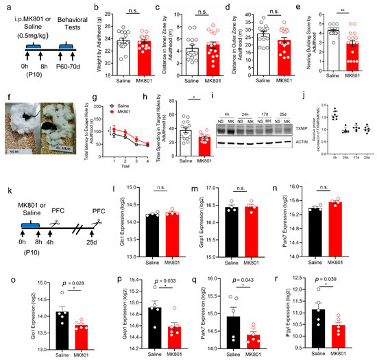 Next, we investigated the expression of TXNIP in a schizophrenia-like mouse model. This model was established and published in our previous study, in which two transient intraperitoneal injections of MK801 (0.5 mg/kg) on P10 could induce schizophrenia-like behaviors in adolescent mice (~P35) [34]. This study expanded our behavioral test to adult mice based on the same paradigm (Figure 5a). MK801 injection did not affect mice weight (Figure 5b), travelling distance for both the inner and outer zones of the cage (Figure 5c,d), indicating that locomotion activity was not disturbed. We observed social deficits (the poor ability of nest building) (Figure 5e,f) and impaired learning and memory (longer latency in entering the escape chamber and less time exploring the target hole) in the adulthood of mice (Figure 5g,h), indicating schizophrenia-like behavior. In this paradigm, we found TXNIP was remarkably induced at 4 h post-MK801 injection; however, this induction rapidly recovered to the level comparable to the control groups (Figure 5i,j). Interestingly, proteomics analysis of PFC showed that the extreme induction of TXNIP did not immediately affect the expression of a set of proteins involved in anti-oxidative stress (Figure 5k–n). In contrast, this effect was displayed two weeks later (P25), in which proteins of LGUL (Lactoylglutathione lyase), GSTP1(Glutathione S-transferase P1), PARK7(Parkinson disease protein 7 homolog), and PYGL(Glycogen phosphorylase, liver form) were significantly decreased (Figure 5o–r). Their reduction indicates an increased level of oxidative stress in PFC. These results suggest that the increased expression of TXNIP associated with schizophrenia might induce enhanced oxidative pressure; however, it was time-dependent and may occur at a latency period.