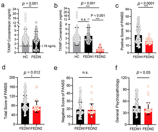 Plasma TXNIP expression in the first episode and drug naïve schizophrenia patients and healthy subjects. (a) The plasma TXNIP level compared with the first episode and the drug naïve (FEDN) schizophrenia patients and healthy subjects. The 1.76 ng/mL threshold was defined as the threshold to discriminate between high and low levels of TXNIP in FEDN schizophrenia patients. (b) Plasma TXNIP level was compared between high level, low level, and all healthy subjects. (c–f) subscale and total score of PANSS (Positive and Negative Syndrome Scale) compared between the low and high levels of plasma TXNIP groups. Data were represented as mean ± SEM. *** p < 0.001; ** p < 0.01; * p < 0.05; n.s. no significance.