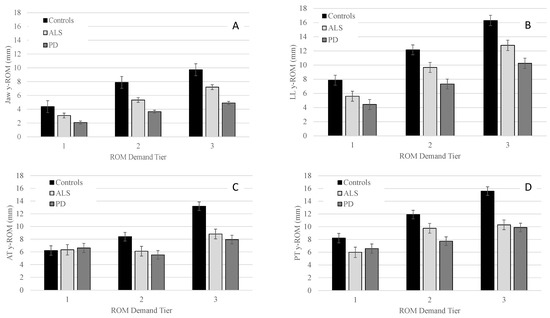 Group means (+/−SE) for y-ROM of the jaw (Panel (A)), lower lip (Panel (B)), anterior tongue (Panel (C)), and posterior tongue (Panel (D)) across all ROM demand tiers.