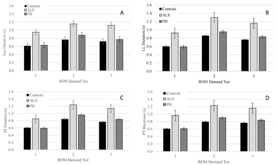 Group means (+/−SE) for movement duration of the jaw (Panel (A)), lower lip (Panel (B)), anterior tongue (Panel (C)), and posterior tongue (Panel (D)) across all ROM demand tiers.