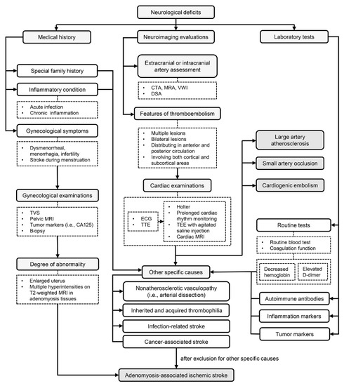 The diagnosis of adenomyosis-associated ischemic stroke is a process of exclusion of many other potential etiologies.