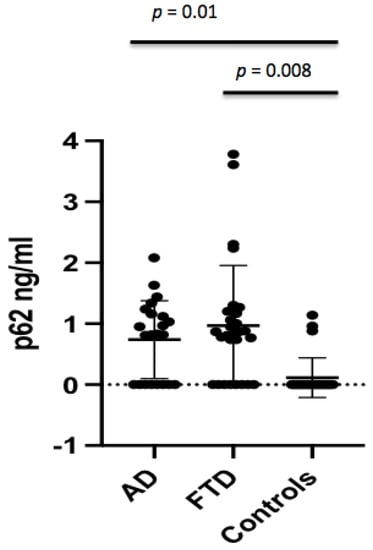 The p62 concentrations were found to be significantly different between AD patients and controls (0.74 ± 0.64 ng/mL vs. 0.15 ± 0.33 ng/mL,