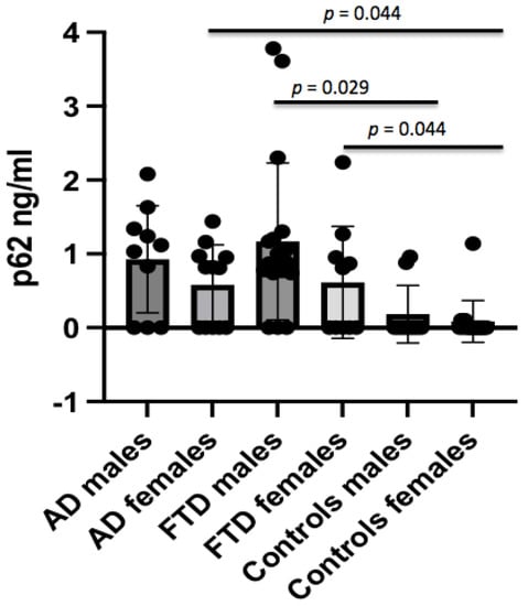 p = 0.01). The p62 concentrations were not different in AD males with respect to male controls, whereas female AD patients showed higher p62 levels when compared to female controls (0.58 ± 0.54 ng/mL vs. 0.07 ± 0.29 ng/mL,