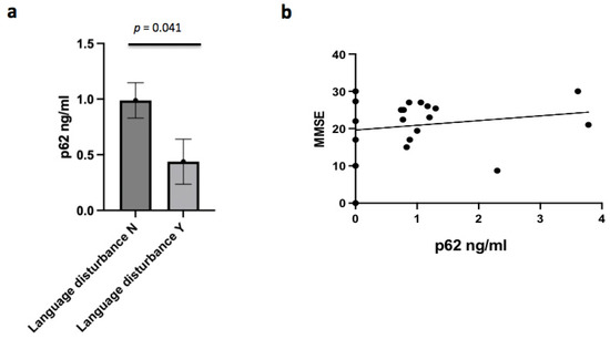 Several clinical features emerged as significantly linked to CSF p62 concentrations in the AD group. In AD patients, p62 levels were negatively associated and with the presence of language disturbance (r = −0.438;