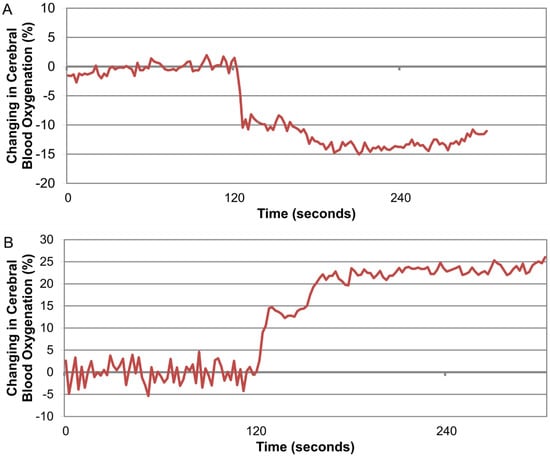Fluctuations in cerebral blood flow in the supine position (0–120 s) followed by the standing position. (A) Cerebral blood flow was increased upon standing. (B) Cerebral blood flow was decreased upon standing.