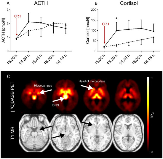 Dex/CRH test: The dex/CRH test was performed as described previously [10,40]. In brief, participants received 1.5 mg dexamethasone per os at 23.00 h on the day before CRH application. Study participants were advised to come in a relaxed state, avoiding psychological or physical stress exceeding their daily routine. On the day of the test, an intravenous cannula was inserted into the cubital vein at 14.30 h and kept patent by isotonic saline infusion at a 20 mL/h rate. The first blood sample (before CRH stimulation) was taken at 15.00 h. At 15.02 h, an i.v. bolus of 100 µg of synthetic human CRH (Ferring, Kiel, Germany) was applied. Subsequent blood samples were taken at 15.30 h, 15.45 h, 16.00 h, and 16.15 h. Samples were stored at 4 °C and centrifuged immediately after the test; serum and plasma, respectively, were taken off, and samples were stored at −80 °C until assayed. Cortisol was measured in serum; ACTH concentrations in EDTA plasma. Dex/CRH test and 5-HTT PET imaging were conducted with a median time difference of 27 days (IQR 5.5–60.5 d).