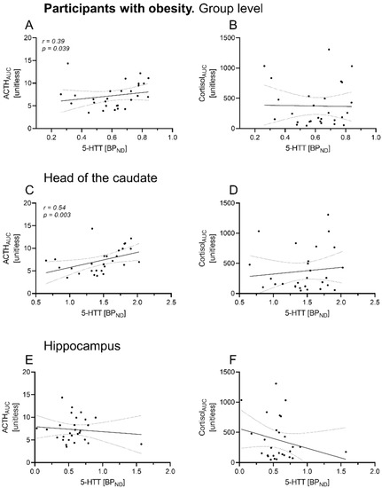The current study adds to the previous notion of an increased HPA axis responsiveness in people with obesity [10], as it associates the neuroendocrine stress response with serotonergic activity in the living human brain. In obesity, ACTH curve indicators were positively associated with averaged 5-HTT BPND throughout the brain, while region-specific correlations could be found between ACTH curve indicators and 5-HTT BPND of the caudate nucleus, but not for cortisol parameters. In non-obesity controls, cortisol AUC correlated positively with hippocampal 5-HTT BPND. These findings support a potential serotonergic–HPA relation that regionally differs between OB and NO. These associations may be explained by either (i) a modulatory effect of the serotonergic tone on the HPA axis, (ii) a bottom-up effect of stress hormones on 5-HTT availability, or (iii) a common, unidentified cause, or a co-variate that mediates this relation, respectively.
