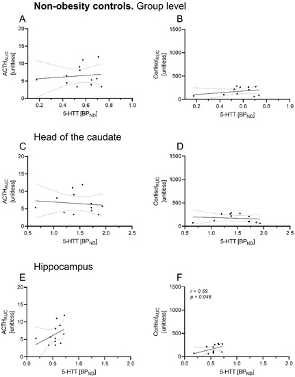 Regions of interest delineated for 5-HTT BPND are shown in a representative image in Figure 1C. In OB, there was a significant positive correlation of ACTHAUC with overall 5-HTT BPND (r = 0.39, p = 0.04), whereas no association was found for cortisol curve parameters (cortisolAUC: r = 0.09, p = 0.65, see Table 2, Figure 2A,B). Region-specific analyses revealed a significant positive relation between ACTHAUC and 5-HTT BPND of the caudate nucleus (ACTHAUC: r = 0.54, p = 0.003), but not of other brain regions (Figure 3C–F). In NO, no correlation of HPA axis curve parameters with overall 5-HTT BPND was found (ACTHAUC: r = 0.05, p = 0.88; cortisolAUC: r = 0.13, p = 0.68; see Table 3, Figure 3A,B). Region-specific analyses showed that cortisol but not ACTH curve parameters correlated significantly with 5-HTT BPND of the hippocampus (r = 0.59, p = 0.04, see Table 2, Figure 3F).