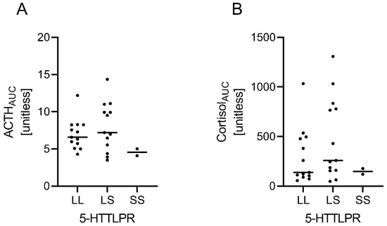 The obesity group was divided into three different subgroups according to their 5-HTTLPR-genotype (S/S, S/L, L/L). Two OB had an S/S, 13 OB S/L and 13 OB L/L alleles, whose dex/CRH test results were compared. There was no statistically significant difference in HPA axis responsiveness between individuals with S/L and L/L genotype (for ACTHAUC: S/L 7.21 [4.96–10.47] vs. L/L 6.58 [5.40–8.29], p ≥ 0.99; for cortisolAUC: S/L 258.8 [157.2–806.8] vs. L/L 138.0 [96.5–487.1], p = 0.73, Kruskal–Wallis test with Dunn’s correction, respectively). HPA axis responsiveness in S/S allele carriers was in the range of the aforementioned, albeit the small subgroup size only allowed preliminary comparison (S/S ACTHAUC: 4.56 [4.10–5.02], p = 0.23 [S/S vs. L/S], p = 0.40 [S/S vs. L/L]; cortisolAUC: 147.8 [119.1–176.6], p = 0.96 [S/S vs. L/S], p ≥ 0.99 [S/S vs. L/L], Kruskal–Wallis test with Dunn’s correction, respectively), see Figure 5.