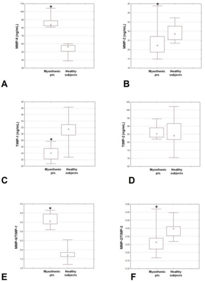 A pathogenetic role of MMPs has been suggested for inflammatory neuromuscular diseases, but the evidence is still very limited [4,6,19]. Elevated levels of MMP-2, MMP-9 and their inhibitors have been observed in patients affected by chronic immune-mediated neuropathies and myopathies, and these levels were influenced by the immunoglobulin therapy [4]. Helgeland et al. examined the levels of MMP-2, MMP-3 and MMP-9 in patients with generalized and ocular MG, reporting elevated MMP-2 and MMP-9 levels [19]. However, TIMPs levels and correlations with clinical findings were not assessed [17].