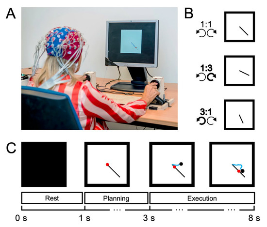 A 64-channel EEG system (BioSemi ActiveTwo (Biosemi, Amsterdam, The Netherlands)) was used, with matching electrode cap positioned according to the 10–20 system. Data were acquired at 2048 Hz, and preprocessed offline in MATLAB (2021a, The MathWorks Inc., Portola Valley, CA, USA) (cf., Appendix A) [50]. Subsequently, EEG data were time-locked to BTT execution stage onset, and epochs were created from −3–3.5 s, with 0 s being execution stage onset. Data for motor planning were analyzed in the −2–0 s window, whereas data for motor execution were analyzed in the 1–3 s window. In line with [21], the first second of motor execution was not analyzed to avoid movement initiation artefacts.