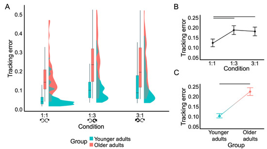 Performance on bimanual tracking task. The tracking error represents compliancy with the imposed movement condition, with a lower value representing better performance. (A). Box- and violin plots showing tracking error distribution per age group and condition. Whisker length is 1.5 × interquartile value. (B). Effect of condition on tracking error. (C). Effect of group on tracking error. Errors bars in (B,C) denote 95% confidence intervals, horizontal black lines denote significant post-hoc contrasts.