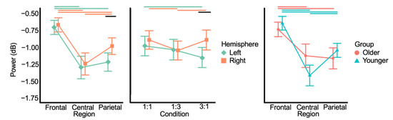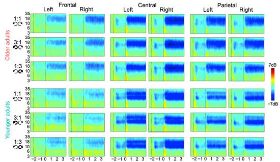 In older adults, MRBD was highest in the central or centroparietal region, depending on the hemisphere. Namely, right central MRBD (−4.684 ± 2.028 dB) was higher than right frontal (−3.23 ± 1.51 dB) (t = −6.899, p < 0.001) and parietal MRBD (−3.67 ± 1.67 dB) (t = −4.800, p < 0.001). Additionally, left central (−4.01 ± 2.04 dB) and left parietal MRBD (−3.91 ± 1.88 dB) were higher than left frontal MRBD (−2.61 ± 1.57 dB) (t = 6.664, p < 0.001 and t = 6.200, p < 0.001, respectively). Additionally, in older adults, right frontal and central MRBD were higher than the left frontal (t = −2.957, p = 0.007) and central MRBD (t = −3.192, p = 0.004), respectively.