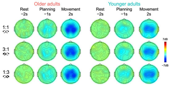 Topographic plots of spectral beta activity during rest, motor planning and execution in both older and younger adults for all three task conditions. The color scaling displays power (−7–7 dB), with blue colors reflecting movement-related beta desynchronization.