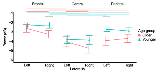 Interaction plots for movement-related beta desynchronization (MRBD) during motor execution. Lower values represent more MRBD. MRBD was higher in older adults, consistent with Hypothesis 2. Partially in line with Hypothesis 3, MRBD was higher in the frontal and central right versus left regions in older adults. Opposed to Hypothesis 4, hemispheric laterality was only present in older adults. Error bars display the 95% confidence interval. Horizontal lines denote significant contrasts with colored and black lines indicating within-group and between-group differences, respectively. Between-hemisphere significant contrasts are visualized brighter than between-region contrasts.