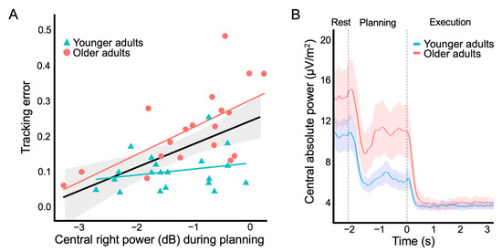 Functional role of movement-related beta desynchronization (MRBD). (A). Correlation between central right motor planning MRBD and tracking error. Better performance (lower error) is associated with higher MRBD. The black line shows the average correlation (ρ = 0.49, p = 0.002), the blue and red lines show the correlations for younger (ρ = 0.14, p = 0.551) and older adults (ρ = 0.56, p = 0.014). (B). Absolute central power (post-Laplacian transformation), during the bimanual tracking task (BTT). This figure aids mechanistic understanding of MRBD. Here, MRBD is the reduction of beta power at a specific timepoint during motor planning or motor execution, relative to beta power during rest.
