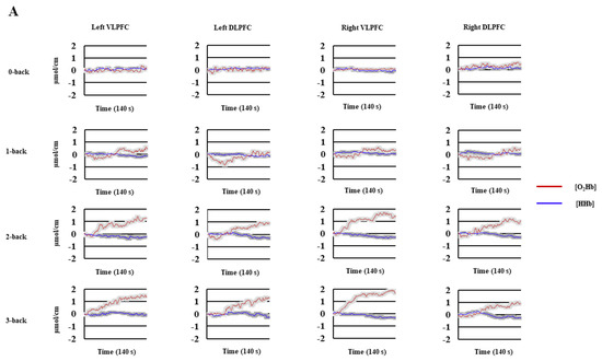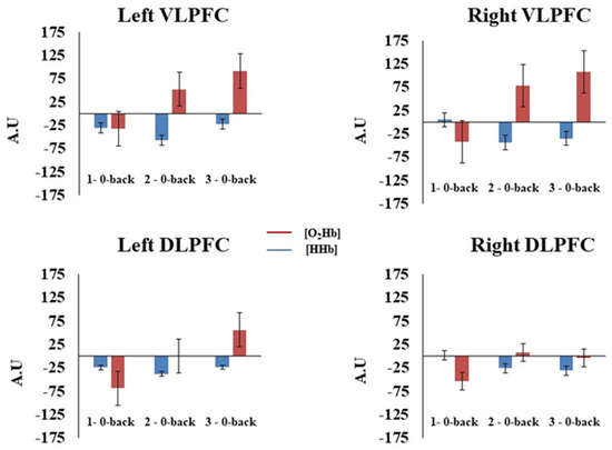 Regarding working memory updating, as measured by the n-back task, functional magnetic resonance imaging (fMRI) studies have shown that the bilateral and medial posterior parietal cortex, bilateral premotor cortex, dorsal cingulate/medial premotor cortex, bilateral rostral prefrontal cortex, bilateral dorsolateral prefrontal cortex (DLPFC), bilateral mid ventrolateral prefrontal cortex (VLPFC), bilateral precuneus, and left anterior insula and bilateral thalamus regions are consistently activated [5,9,13]. Other studies that have used functional near-infrared spectroscopy (fNIRS) highlighted the role of the prefrontal cortex (PFC) during the n-back task [8,14]. Indeed, the hemodynamic activity of the PFC was shown to be bilateral [7], but with a strong activation of the left hemisphere, particularly for the verbal version of the n-back task [14]. In addition, other studies have shown that the hemodynamic activity of the PFC increases substantially with an increasing working memory load [15,16,17]. According to Vermeij and collaborators, the hemodynamic activity of the right PFC in young participants was slightly dominant at low levels of working-memory load (0-back, 1-back), while it became more bilateralized at a higher cognitive load (e.g., two-back) [17]. On the contrary, Saikia and collaborators also showed an increased bilateral PFC activation as a function of an increasing cognitive load (from one-back to three-back) and reported a slightly greater overall activation over the left PFC [16]. Further studies should address these discrepancies, acknowledging that these two fNIRS studies did not differentiate between the DLPFC and VLPFC.