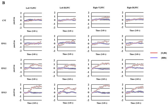 We used standard procedures that have already been adopted in data processing previously [15,17]. First, the raw data were converted into the optical density, which was then converted into ΔO2Hb and ΔHHb using the modified Beer–Lambert Law. A moving Gaussian window of 1 s was applied to the hemodynamic signals to filter the noise of the heartbeat frequency. Matlab’s movement artifact reduction algorithm (MARA) [46] was used to remove the potential motion artifacts. After the filtering process, a bias removal was made 10 s after the beginning of each experimental condition [15,17]. The grand average of the mean hemodynamic activity during each executive task condition is summarized in Figure 1. Then, the area under the curve (AUC) was calculated for [O2Hb] and [HHb] utilizing the approximate integration method [47,48] for each experimental condition (control conditions: 0-back and CNT; cognitive load: 1, 2, 3-back and RNG1, RNG2, RNG3). Finally, we subtracted the AUC of the control conditions from each cognitive load of both tasks [18] to determine the specific patterns of the cerebral activation.