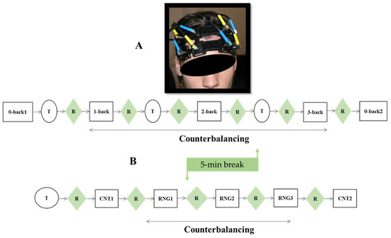 (A) Picture of the optode configuration setup on the forehead of one participant. (B) Schematic representation of the experimental course. R = 90-s pause; T = training; n-back counterbalancing = 1, 2, 3-back–1, 3, 2-back–2, 1, 3-back–2, 3, 1-back–3, 1, 2-back–3, 2, 1-back; RNG counterbalancing = RNG1, 2, 3–RNG1, 3, 2–RNG2, 1, 3–RNG2, 3, 1–RNG3, 1, 2–RNG3, 2, 1.